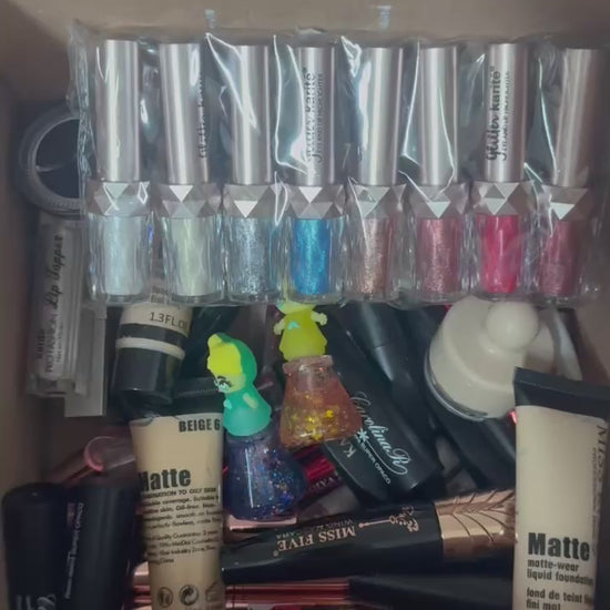 i lotti variano , all'interno si può trovare fondotinta , ombretti , mascara , eye-liner , matite , rossetti , lip , lucido , tinte labbra e tanto altro!